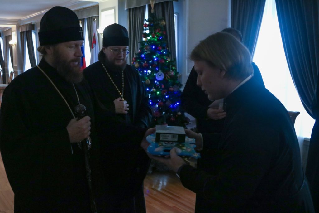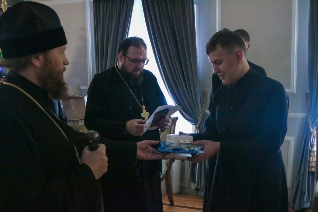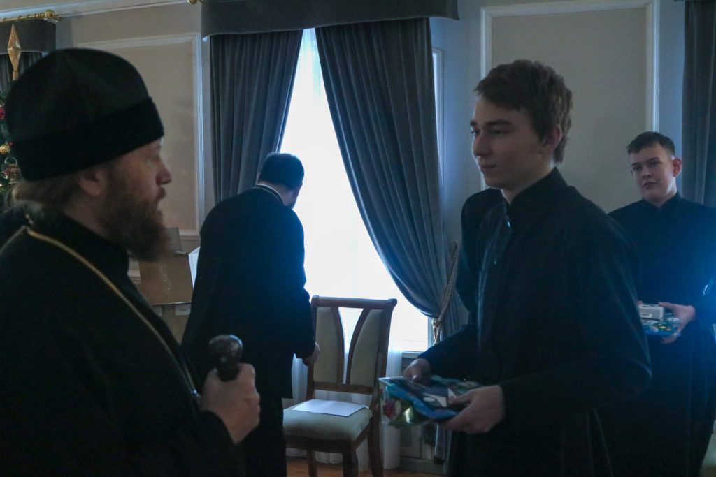После поздравительных слов Владыка Савва вручил учащимся рождественские подарки, а победителям спортивных турниров, проходивших в первом семестре, памятные призы. Воспитанники семинарии прославили праздник Рождества Христова соборным пением молитвословий праздника.