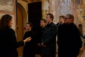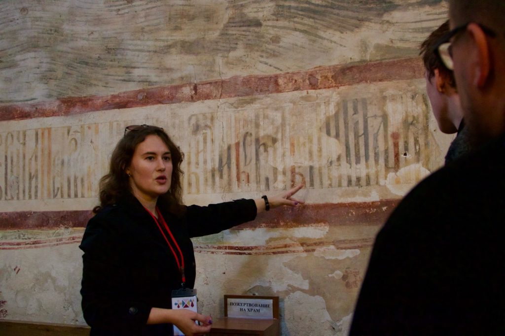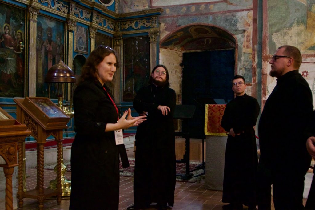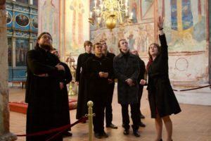 В храме студентам рассказали о многовековой истории Вологды, об истории строительства соборного храма и этапах его благоукрашения. Внутри собора посетители познакомились с фресковой живописью, узнали о вологодских архиереях, погребенных в храме, о древней иконе Софии Премудрости Божией.