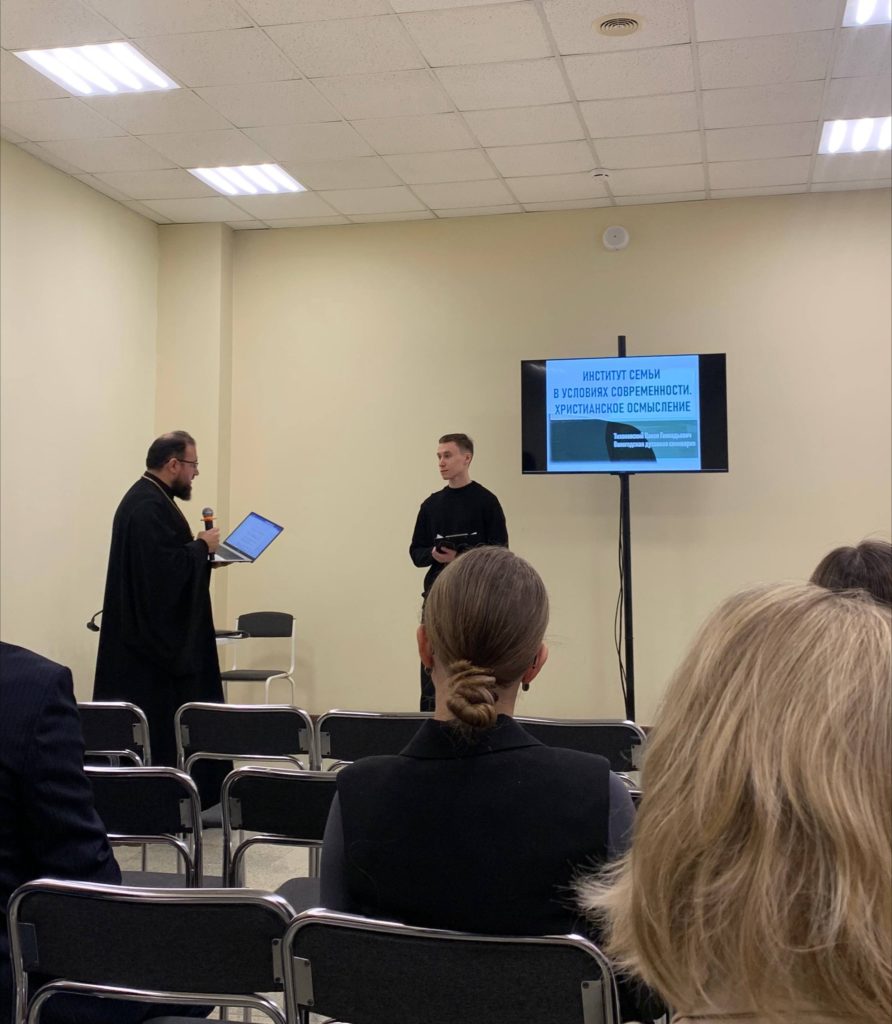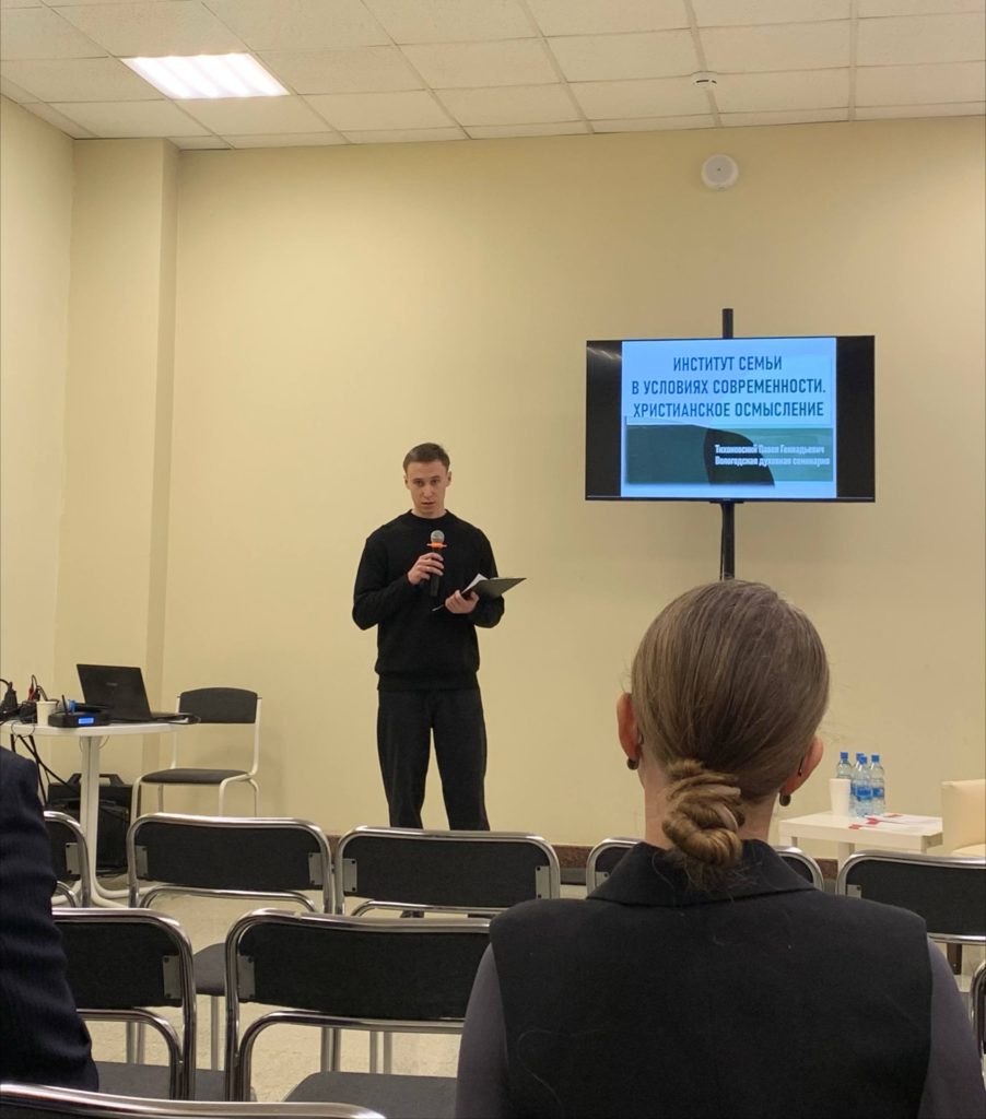 Выступление ректора семинарии протоиерея Алексия Ольховникова было посвящено проблеме семьи в контексте Священного Писания. Доклад Павла Тихоновского был посвящен развитию и становлению института семьи в современном мире. Докладчик обратил внимание на современные вызовы, перед которыми стоит сегодняшняя семья, а также предложил свои наработки по формированию готовности студентов к семейной жизни.