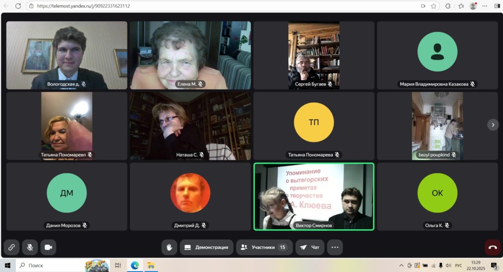 22 октября 2025 в дистанционном формате прошли 40-е Межрегиональные Клюевские чтения, посвященные 141-летию со дня рождения Николая Клюева и 130-летнему юбилею Сергея Есенина. Мероприятие объединило исследователей из Вологды, Вытегры, Москвы, Петрозаводска, Рыбинска и Санкт-Петербурга.