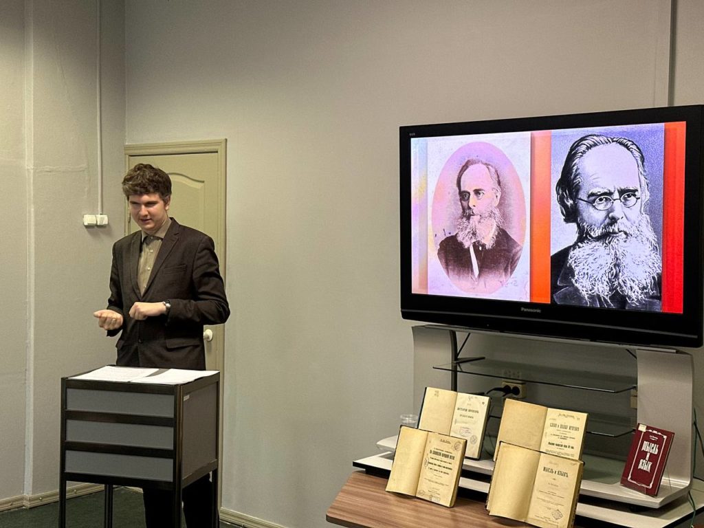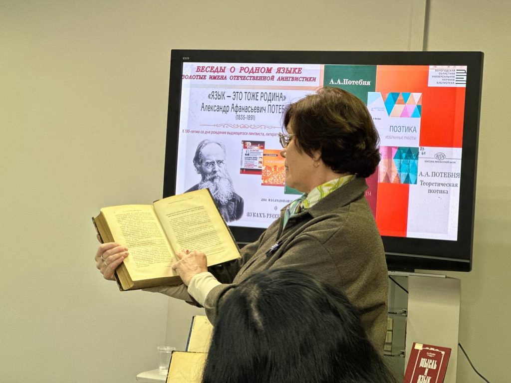 16 октября 2025 года в стенах Вологодской областной универсальной научной библиотеки состоялась очередная встреча в рамках проекта «Беседы о родном языке», которую посетили студенты Вологодской духовной семинарии. В этот раз культурно-просветительское мероприятие было посвящено 190-летию со дня рождения выдающегося филолога Александра Афанасьевича Потебни (1835-1891).