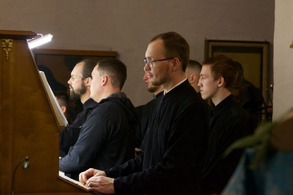 За воскресным богослужением пел мужской хор братии монастыря и студентов семинарии под управлением регента чтеца Артемия Коровина.