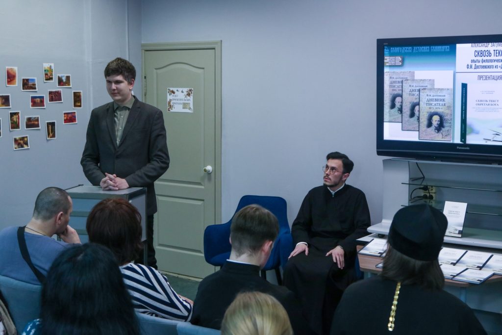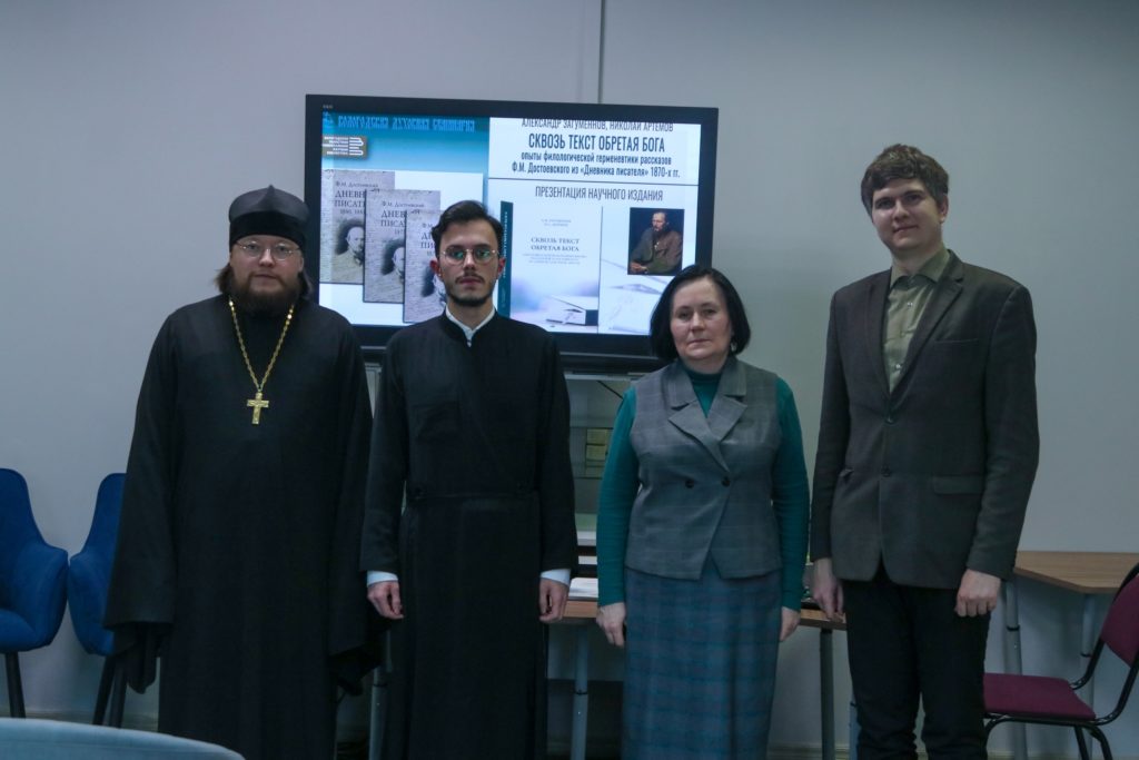 15 января в стенах Вологодской областной универсальной научной библиотеки состоялась презентация монографии «Сквозь текст обретая Бога: опыты филологической герменевтики рассказов Ф. М. Достоевского из «Дневника писателя» 1870-х гг.» Александра Владимировича Загуменнова, кандидата филологических наук, заведующего заочным сектором бакалавриата, доцента кафедры гуманитарных и естественнонаучных дисциплин Вологодской духовной семинарии, и чтеца Николая Сергеевича Артёмова, выпускника нашей семинарии, сейчас – магистранта 1 года обучения Санкт-Петербургской Духовной Академии.